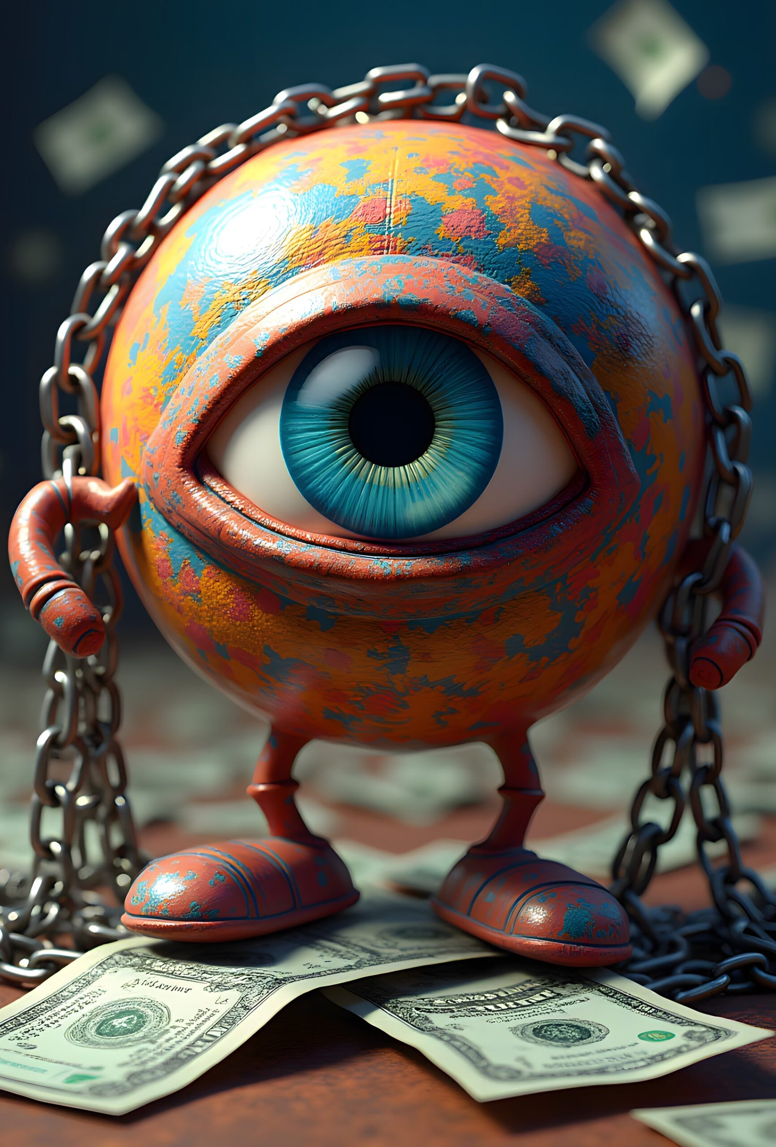 This psychedelic greeting card shows Earth bound in heavy chains, symbolizing how money dominates our world. Surreal, thought-provoking, and deeply visionary, it’s a bold statement piece for any space.